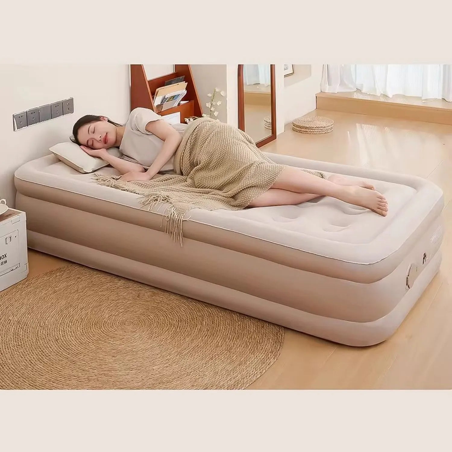 Se infla cuando lo necesitas y se guarda en minutos. Perfecto para apartamentos pequeños, habitaciones auxiliares o viajes. ¡Siempre tendrás cama disponible sin ocupar espacio! 🎒🏡