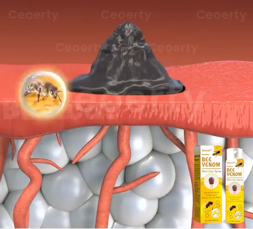 Tras la pulverización, moléculas activas microscópicas (compuestas de veneno de abeja, aceite de árbol de té y tocoferol) penetran en la piel, llegando a la raíz de las manchas, papilomas y verrugas.